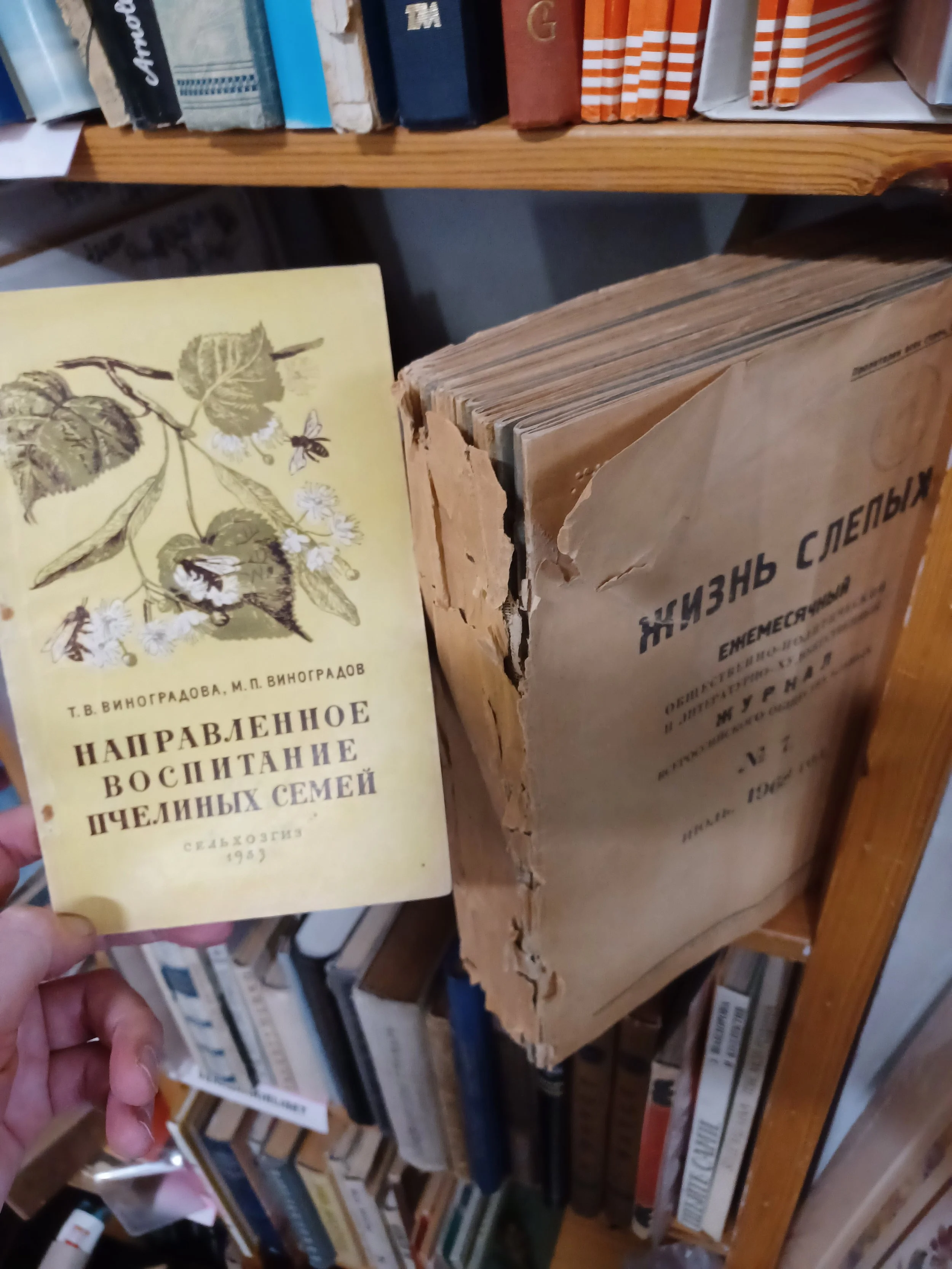 Ze schoof een grote plastic zak opzij en wees me op drie planken met boeken in het Russisch. Er zat niets van mijn gading bij, al trof ik wel weer zo’n boek aan waar ze volgens mij in de Sovjetunie het patent op hadden, zo’n werkje met instructies voor - vermoed ik - niet al te wijdverbreide activiteiten, in dit geval “Gerichte opvoeding van bijenfamilies”, geschreven door T.V. Vinogradova en M.P. Vinogradov (die zullen wel met elkaar getrouwd zijn geweest), uitgegeven in 1953 door Selchozgiz, een verzameling lettergrepen die staat voor Landbouwstaatsuitgeverij. Het deed me meteen denken aan dat prachtige boek dat ik ooit in Sint-Petersburg op de kop tikte, waarin gedetailleerd wordt uitgelegd wat je moet doen als je een olifant wilt opzetten. (En ik voeg daar graag nog aan toe het grammofoonplaatje met uitleg hoe je met jank-achtig gehuil wolven kan lokken, om die vervolgens overhoop te schieten.)