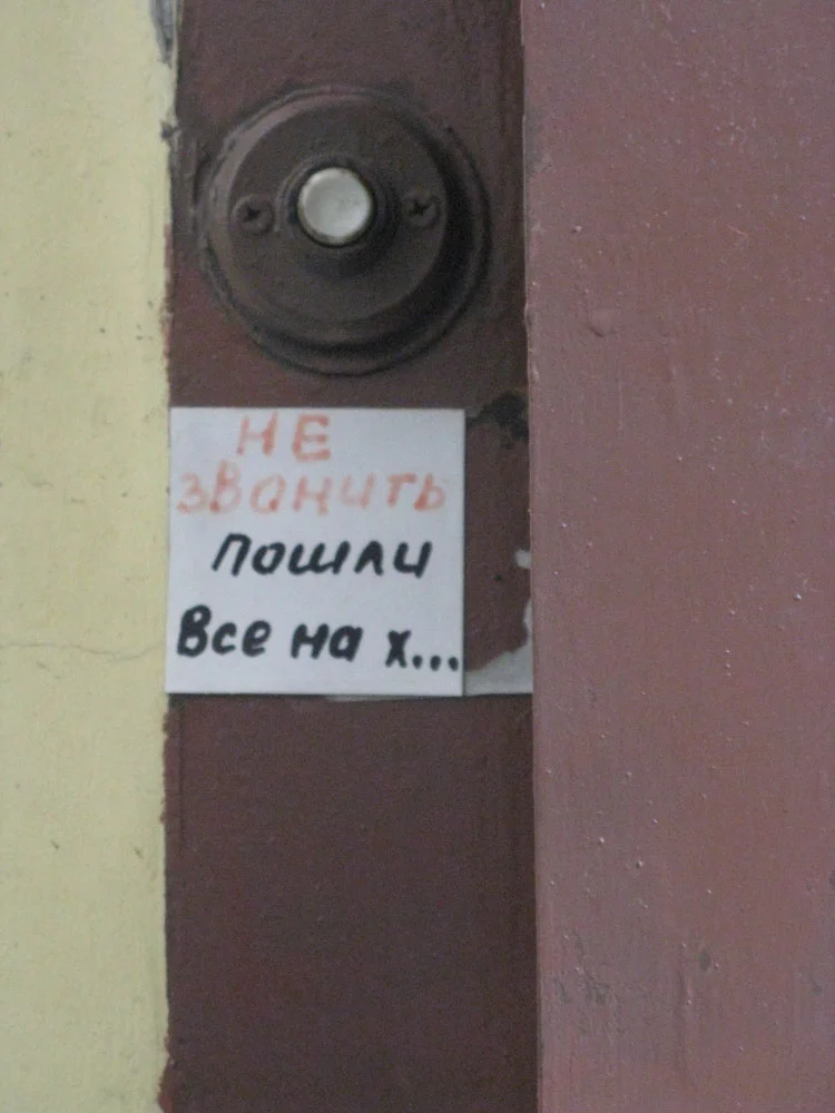 Teruglopend, nog steeds op de binnenplaats, zag ik op de deur van het portiek vlakbij het hek een verzoek staan: niet bellen en niet kloppen. Onder de bel hing ook nog een briefje. Dat ziet u op de foto hieronder. Ik ga dat niet vertalen, maar neemt u van mij aan dat het een vrij overtuigend verzoek is om inderdaad niet aan te bellen of te kloppen.